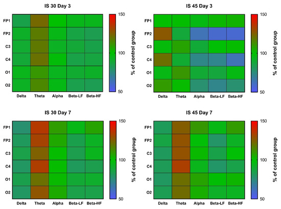 Mean wave amplitudes were not significantly different among all groups both on post-surgery days 3 and 7 (Figure 5, Tables S1 and S2). Notably, the changes in these parameters resembled the changes in rhythm indices mentioned earlier; for instance, we observed reduced δ activity in the FP2/C4 area in the IS 45 group on day 3, as well as a non-specific decrease in δ accompanied by an increase in θ activity in both IS groups on day 7 (Figure 5, Tables S1 and S2).