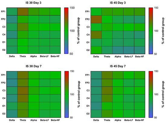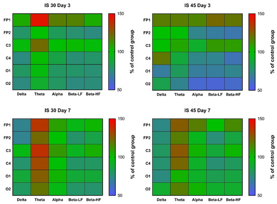Heatmaps of δ, θ, α, high and low frequency β wave rhythm indices in channels FP1, FP2, C3, C4, O1, and O2 at post-surgery days 3 and 7. Data were normalized to the respective control values (n = 6). IS 30 (n = 6) and IS 45 (n = 6), groups subjected to cerebral ischemia for 30 and 45 min, respectively.
