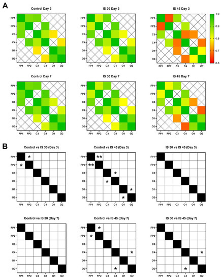 Cross-correlation matrices (A) and statistical analysis results (B) for pairwise correlations FP1-FP2, C3-C4, O1-O2, FP1-C3, FP-C4, C3-O1, and C4-O2 for all groups. Connectivity strength is color-coded according to (A). Empty cells in (B) indicate no significant difference among the Control and IS 30 or IS 45 groups, whereas cells with * or ** indicate significant differences among groups. **, p < 0.01; *, p < 0.05.