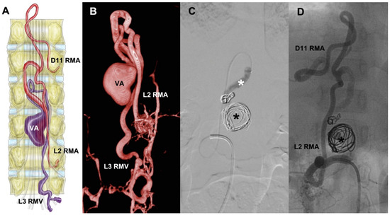 Depiction of a ventral sAVF at medullary cone schematized (A). It has two feeders at right D11 and L2 RMA, and then it shows a venous aneurysm followed by its drainage through L3 RMV. (B) The 3D sDSA reconstruction, followed by the embolization process and the exclusion of the lesion (C,D). RMA = radiculomedullary artery, RMV = radiculomedullary vein, VA = venous aneurysm, black asterisk = coils inside VA, white asterisk = Histoacryl at the sAVF. Illustrated by J. Lizana.