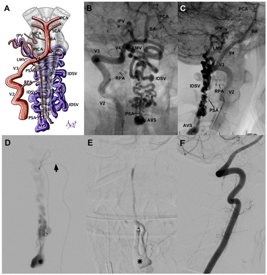 - Hiramatsu, M.; Sugiu, K.; Ishiguro, T.; Kiyosue, H.; Sato, K.; Takai, K.; Niimi, Y.; Matsumaru, Y. Angioarchitecture of arteriovenous fistulas at the craniocervical junction: A multicenter cohort study of 54 patients. J. Neurosurg. 2017, 128, 1839–1849. [Google Scholar] [CrossRef] [PubMed] [Green Version]