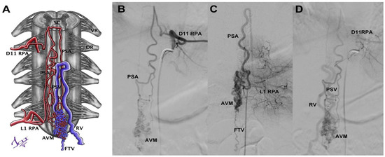 - Osbun, N.J.; Kim, L.J. Classification of Spinal Arteriovenous Lesions: Arterivenous Fistulas and Arteriovenous Malformations. In Youmans & Winn Neurological Surgery, 7th ed.; Winn, H.R., Ed.; Elsevier: Philadelphia, PA, USA, 2016; Volume 4, pp. 3563–3566. [Google Scholar]