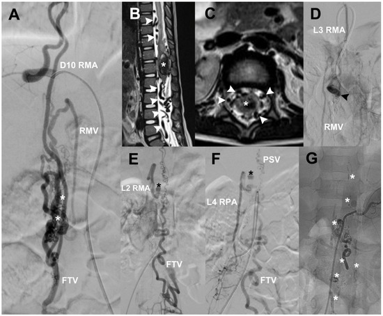 (A) A diffuse CM sAVM case; white asterisks mark the place of the diffuse nidus, and the first afferent is right D12 RMA while the drainage goes to RMV and FTV. Lumbosacral T2-MRI shows flow voids (white arrowheads) and hematomyelia (white asterisks) (B,C). (D) One fistulous component at left L3 RMA; a venous aneurysm (black arrowhead) and its drainage through RMV. Other fistulas are seen at right L2 RMA (E) and right L4 RPA (F) while their drainage goes through PSV and FTV; a small arterial aneurysm (black asterisk) can be seen. (G) A negative control sDSA after Histoacryl embolization (white asterisks) and surgical management. CM = conus medullaris, RMA = radiculomedullary artery, RPA = radiculopial artery, RMV = radiculomedullary vein, FTV = filum terminale vein, PSV = posterior spinal vein.