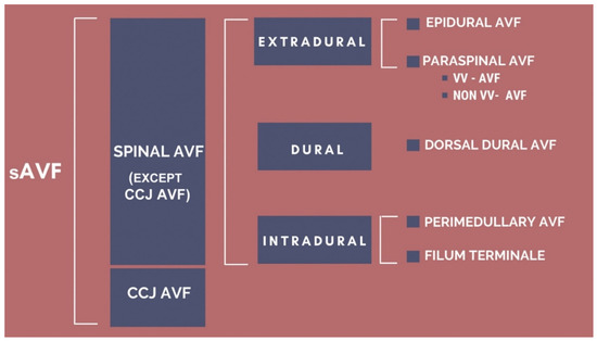 Another classification, proposed by Zozulya in 2006, tried to unify aspects of the previous classifications, adding intravertebral malformations [33]. This classification describes anatomical, hemodynamic, and angioarchitectural characteristics [33]. Nevertheless, the complexity of the proposal makes its use very difficult in practice. Finally, the above classifications do not consider paraspinal AVFs and filum terminale AVFs, both of which have unique clinical, radiological, and anatomical characteristics [34,35,36,37].