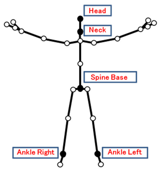 We used a high-performance video camera equipped with an infrared device (Kinect v2), which is an infrared light source, and which is sensitive to infrared light [8]. The Kinect v2 is a range-imaging camera system employing time-of-flight techniques to resolve the distance between the camera and the subject for each point of the image by measuring the round-trip time of an infrared light signal emitted by the camera. The camera was horizontally placed at a distance of 4 m from the subject’s position and adjusted to a height of 80 cm from the floor. Before beginning to walk, subjects remained in a sitting position to rest for 5 min and were confirmed as having no fatigue. Then, the subjects were instructed to walk naturally toward the camera, and gait motions from the 4 m point to the 2 m point were recorded every 1/30 s. The subjects were instructed to pass the 2-meter point without stopping. The subjects maintained their faces toward the camera, and the horizontal, vertical, and anteroposterior directions were defined as the X-axis, Y-axis, and Z-axis, with the right, upper, and front sides being the + direction of each respective axis.