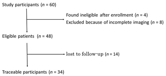 A total of 60 patients were enrolled between September 2020 and March 2022. (These patients are referred to as “study participants”.) As shown in Figure 2, among the study participants, 4 were found ineligible after enrollment, and 8 were excluded because of incomplete imaging; thus, 48 PD patients underwent motion analyses with AKIRA®. (These patients are referred to as “eligible patients”.) Of the eligible patients, 34 PD patients underwent the usual treatment for 1 year. (These patients are referred to as “traceable participants”) (see Figure 2).