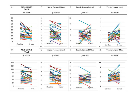 As shown in Figure 3, the subtotal score for Part III of the MDS-UPDRS after 1 year was significantly improved compared to the baseline score (p = 0.020); however, the Part II subtotal and the total scores of the MDS-UPDRS and the Hoehn and Yahr scale remained unchanged, and the Part I subtotal score of the MDS-UPDRS worsened significantly (p = 0.047). Meanwhile, for the AKIRA® measurements, the mean and maximum forward tilt angles of the neck were significantly improved (p = 0.013, 0.003, respectively); however, the mean and maximum forward tilt angles of the trunk showed no significant changes. Both the mean and maximum lateral tilt angles of the trunk worsened significantly (p = 0.008, 0.021, respectively).