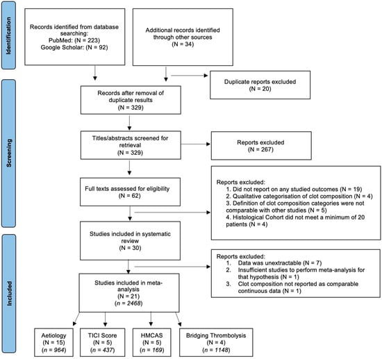 Huang, J.; Killingsworth, M.C.; Bhaskar, S.M.M. Is Composition of Brain Clot Retrieved by Mechanical Thrombectomy Associated with Stroke Aetiology and Clinical Outcomes in Acute Ischemic Stroke?—A Systematic Review and Meta-Analysis. Neurol. Int. 2022, 14, 748-770. https://doi.org/10.3390/neurolint14040063