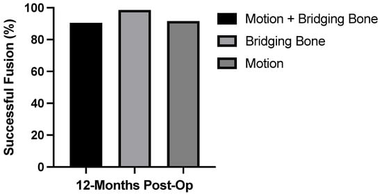 Spinal fusion success rate. A high rate of fusion success was observed in lack of motion + bridging bone, bridging bone only, and lack of motion only.