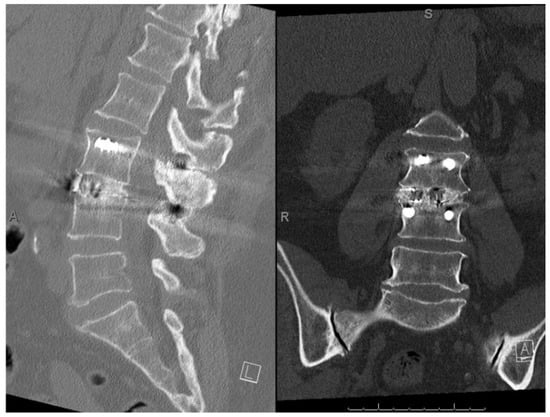 Spinal fusion success. One-year postoperative CT scan demonstrating successful bridging bone on sagittal and coronal reconstructions.