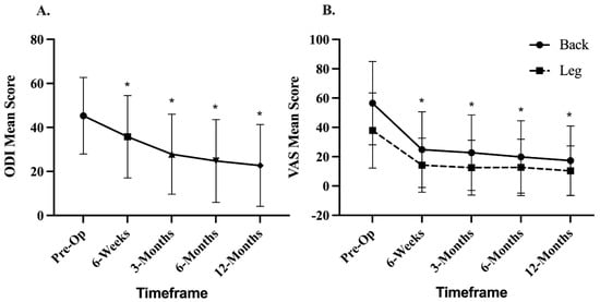 ODI and VAS scores through 12 months postoperation. (A). Mean ODI scores up to 12 months. (B). Mean VAS-back and VAS-leg scores up to 12 months. A significant improvement in ODI and VAS score was observed at all time points through 12 months, * p < 0.0001. ODI, Oswestry Disability Index; VAS, visual analogue scale.