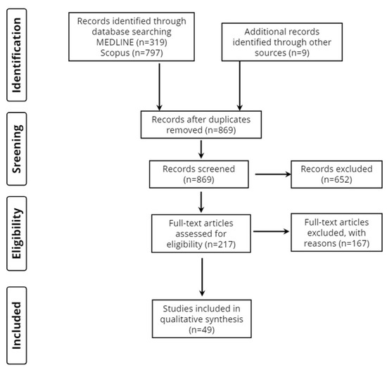 Overall, 1125 records were retrieved from the database search. Duplicates and irrelevant studies were excluded; hence, a total of 217 articles were selected. After screening the full text of the articles, 49 studies were eligible for inclusion.