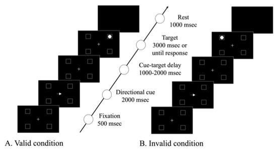 Modified Posner task method. (A) valid condition, (B) invalid condition.