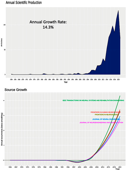 According to the annual scientific production (top) and source growth (bottom), there is rising scientific interest in using EEG in neurorehabilitation.