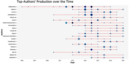 The top-20 most productive authors are depicted in Figure 2, while most-cited countries, based on the first author’s affiliation, are shown in Table 3. G. Pfurtscheller, N. Birbaumer, and J.R. Wolpaw occupy the top three of the most cited authors, with 975, 875, and 501 citations, respectively.