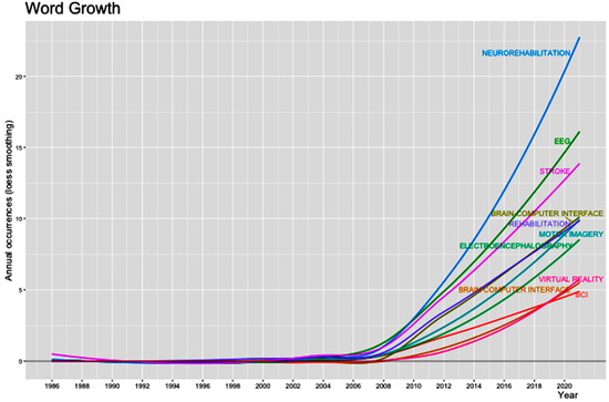 The top-20 most common author’s keywords and the trends regarding word growth are depicted in Table 4 and Figure 3. Except for the words “rehabilitation” and “electroencephalography” and their derivatives, the term “brain–computer interface” predominated among the author’s keywords, with 180 occurrences in various forms. We also recorded a rising trend in all keywords since 2005. However, the trends changed over time, from the use of “function 9rganization magnetic imaging” to “brain–machine interface”, “motor imagery”, and “deep learning”.