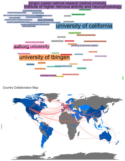 According to the primary author, the US, Italy, and Germany were the topmost productive countries. According to the MCP/SCP ratio, many of the leading countries, such as the US (21%), Italy (19.78%), and China (16%), were limited in local co-operations. In contrast, countries such as Denmark (75%), Singapore (62%), Spain (61%), France (53%), Canada (47%), Australia (45%), Belgium (44%), and Germany (42%) were involved in more-extensive collaborations. Accordingly, the collaboration analysis map among institutions revealed a major co-operation network centered on the University of Lund (Figure 4, top). The remaining collaborations were limited to no more than a couple of institutions in every case.