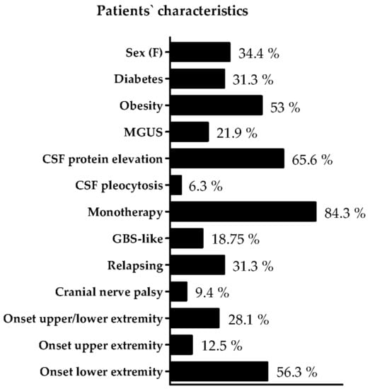 The mean IVIg dose in our cohort was 1.07 ± 0.37 g/kg in four weeks. A detailed depiction of the individual patients’ characteristics can be found in Figure 2 and Table 1. Median age of the patients was 64 years (IQR 57–70). 11 patients (34.4%) were female. 10 patients (31.3%) were diagnosed with diabetes, 17 had obesity (53.1%), and, in seven patients, MGUS was detected (21.9%). The results of the lumbar puncture performed when the diagnosis was made was evaluated. 21 patients (65.6%) had elevated protein level in the CSF. Two patients (6.3%) had a pleocytosis in the CSF. 27 patients (84.3%) were treated with IVIg as monotherapy. Onset of GBS-like symptoms was recorded in six patients (18.8%), and a relapsing form was detected in 10 patients (31.3%). Three patients (9.4%) had affection of cranial nerves during the disease course. Nine patients (28.1%) had affection of both lower and upper extremity as initial manifestation. Only the upper extremity was initially symptomatic in four patients (12.5%), and only the lower extremity was initially symptomatic in 18 patients (56.3%). The median time of disease duration was 10 years (IQR 4.8–14.3), and the delay between symptom onset and diagnosis of CIDP was one year (IQR 0–3.5). Mean INCAT score was 2.8 (median 2, IQR 1–4.6), and mean MRC SS was 55.8 (median 58, IQR 53.8–60).