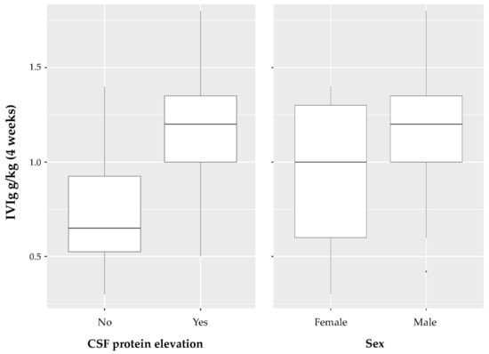 Box plot diagram for CSF protein elevation and sex. For the two characteristics (CSF protein elevation and sex) with the highest coefficients in the multivariabe regression model, a box plot diagram depicting the pattern of data distribution is shown.