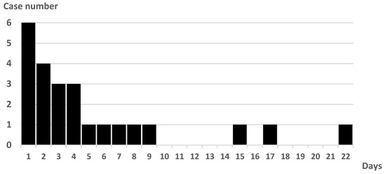 The onset of PSP was 67% on days 1–4 after admission (day 1: day of admission). The latest onset of PSP from admission was on day 22 (Figure 1). All patients had sputum cultures before antimicrobial administration. The initial culture examination revealed 1, 2, 17, and 4 cases of Geckler 5, 4, 3, and 2 or less, respectively. Enterobacter aerogenes was detected in the sputum of Geckler 5 methicillin-sensitive Staphylococcus aureus (MSSA), and Klebsiella pneumoniae (K. pneumoniae) and Streptococcus agalactiae were detected in the sputum of Geckler 4. MSSA, K. pneumoniae, Serratia marcescens, and Stenotrophomonas maltophilia were cultured in relatively high numbers from the sputum of Geckler 3. Culture results are shown in Table S1. Ampicillin/sulbactam (ABPC/SBT) was the most frequently selected antimicrobial (57%) (Figure 2). Among the 24 patients with PSP, 8 had no NGT insertion, 5 had NGT insertion before the onset of PSP, and 11 had NGT insertion after the onset of PSP. Seven patients had NGTs inserted at discharge. Three deaths occurred in the PSP group. The cause of death was cerebral herniation due to worsening cerebral infarction in 2 patients, and the combination of PSP and candidiasis in 1 patient.