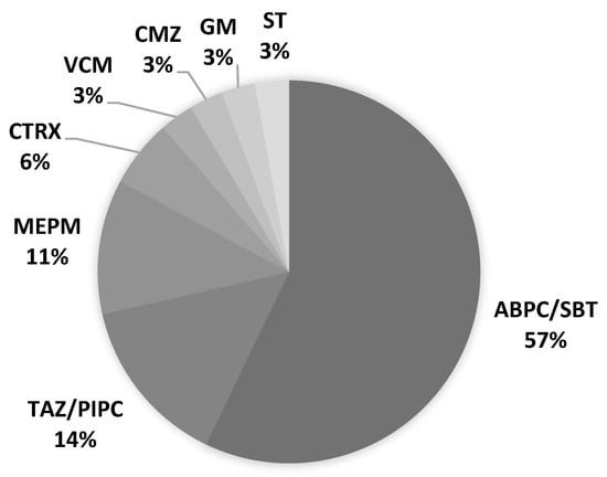 Antimicrobial agents selected for PSP treatment. ABPC/SBT: ampicillin/sulbactam, CMZ: cefmetazole, CTRX: ceftriaxone, GM: gentamicin, MEPM: meropenem, ST: sulfamethoxazole/trimethoprim, TAZ/PIPC: tazobactam/piperacillin, VCM: vancomycin.