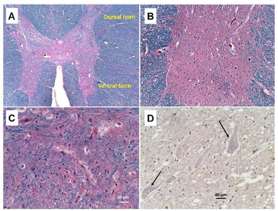 Ventral nerve root degeneration in the ALS cases was associated with loss of myelin and axons with notably greater severities in lumbar compared with thoracic levels (Figure 4). LHE stains highlighted myelin loss, vacuolation, thinning fiber (Figure 4A,B). Neurofilament immunohistochemical staining revealed conspicuously greater degrees of axonal loss, axonal swelling, and fiber variability in lumbar (Figure 4C) compared with thoracic (Figure 4D) nerve roots.