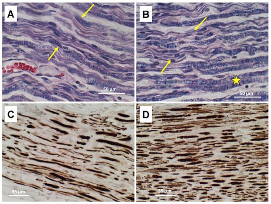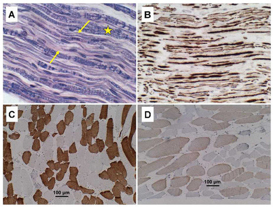 Ventral nerve root degeneration and skeletal muscle myofiber type grouping in PPS. Spinal ventral nerve roots (A) stained with LHE or (B) immunostained with antibodies to neurofilament show loss of myelinated fibers in A. For example, between arrows, asterisk marks normally myelinated fibers, and in (B), loss of axon is represented by the clear gaps among fibers. (C,D) Histological sections of quadriceps muscle immunostained to detect (C) fast or (D) slow myosin. Note clear grouping according to myofiber type, i.e., fast versus slow. Brown staining precipitates in (B–D) correspond to positive immunostaining results. (C,D) Scale bars = 100 µm.