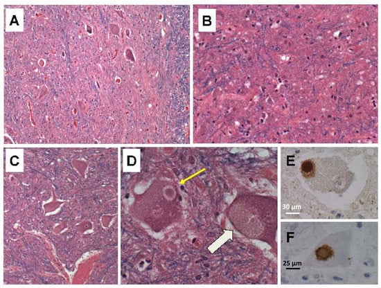 Due to the presence of overlapping early AD-type neurodegeneration, we considered ALS in the differential diagnosis. To help solidify the diagnosis of PPS, we compared the findings in our index case to six ALS cases that were autopsied within the same time period. The ALS cases ranged from 60 to 80 years of age. All were male with White race, and none had a history of poliomyelitis. The cases were donated to the Brown University Brain Bank (re-named Brain Tissue Resource Center at Brown University) for research. Oversight for the human postmortem studies was provided by the Lifespan IRB committee #008303. The approval code was Human Studies Exemption #211037, initially issued on 30 March 2003. The postmortem brains, spinal cords, and skeletal muscle specimens were processed and evaluated using the same standard protocol. In all six cases, the populations of large motor neurons in Brodmann Area 4 (precentral gyrus) were markedly diminished. Loss of neurons was associated with gliosis of deep cortical layers and subcortical white matter, and Wallerian degeneration accompanied by axonal spheroids in the lateral and anterior corticospinal tracts at all levels (Supplementary Figure S1). Atrophy of the spinal anterior horns was associated with neuronal degeneration, neuronal loss, replacement gliosis (Figure 3A–C) and neuronal cytoplasmic inclusion bodies that were readily detected in LHE-stained sections (Figure 3D). Immunohistochemical staining confirmed the inclusion bodies corresponded to TDP-43-positive (Figure 3E) and ubiquitin-positive (Figure 3F) Bunina bodies. All six cases of ALS had variable degrees of overlapping neurodegeneration, e.g., FTLD, PD, or AD.