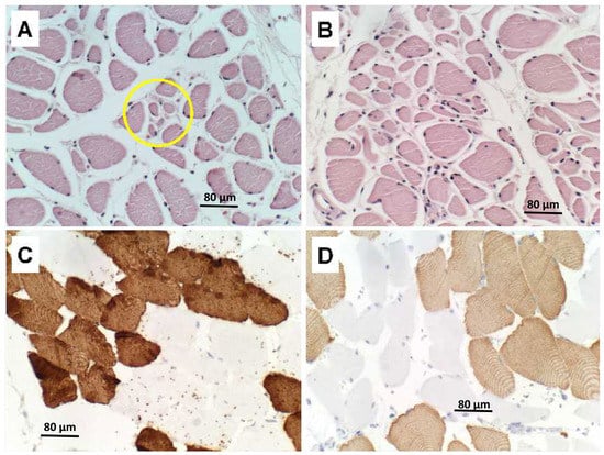 Skeletal muscle (A,B) denervation atrophy with myofiber hypertrophy and myofiber type grouping in ALS. Histological sections stained with H&E show (A) small (circled) and (B) large group myofiber atrophy with no endomesial fibrosis in different areas of quadriceps muscle. Additional sections from the same blocks immunostained to detect (C) fast (Type 2) or (D) slow (Type 1) myosin show clear myofiber type grouping away from the regions with active denervation as shown in Panels (A,B). (A–D) Scale bars = 80 µm.