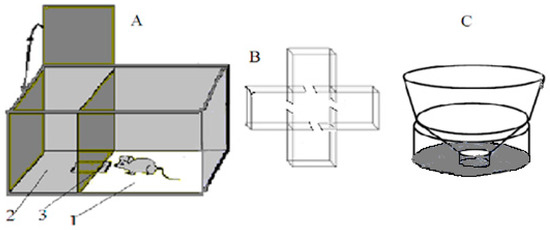 Schematic drawing of (A) the puzzle-box experimental box featuring (1) brightly lit part of the puzzle-box, (2) the dark part of the box and (3) the underpass, connecting both parts; (B) the closed plus-maze; and (C) an unescapable slippery funnel.
