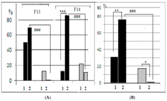 (A) Proportion (%, ordinate) of LB and SB mice which were able to solve the puzzle-box stages when the underpass was blocked by the plug in F13 and F14. (B) Summarized scores for two generations. Designations are as in Figure 3. *, **, ***—significant LB and SB intergroup differences (AT vs. control) (p < 0.05, 0.01 and 0.001, respectively), ###—significant differences between LB and SB control groups, p < 0.001 (φ criterion for alternative groups).