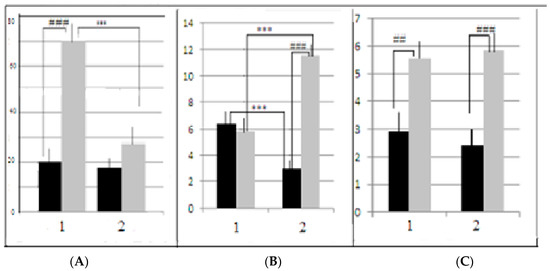 (A) Mean latencies (ordinate, s ± stand. err.) of the first approach to the underpass. (B) Mean numbers of freezing episodes (ordinate, ± stand. err.), summarized for 4 puzzle-box test stages in LB and SB groups, AT (1) and control (2) groups. (C) Summarized defecation scores, Designations are as in Figure 3. ***—significant differences between AT and control groups, p < 0.00; ##, ###—significant differences between the LB and SB groups, for p < 0.01 and p < 0.001, respectively, (2-factor ANOVA, “strain” and “treatment as factors, LSD post by Fisher). black columns—LB mice, grey columns—SB mice.