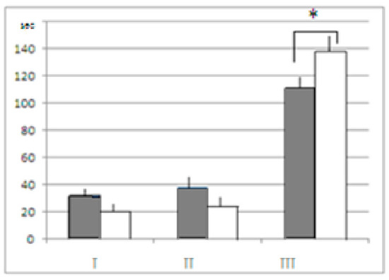 Mean time (ordinate, s, ± stand. err.) spent by mice of both strains in the unescapable slippery funnel. I—active jumps, II—stretched posture of an animal in the funnel gorge above the water surface, III—immobility. White columns—control groups, dark grey columns—mice after AT treatment. *—significant difference (1-factor ANOVA, F1–2 = 5.6218, p = 0.020761).