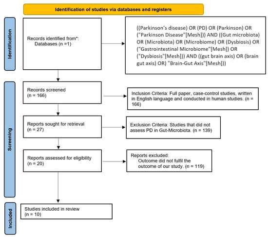 Inclusion criteria were clinical trials conducted on humans and written in English. Exclusion criteria included animal studies, studies that did not assess PD and gut microbiome, and articles that did not fulfill the aim of our research. As described in Figure 2, we only included articles about PD and its association with gut microbiome. After applying these filters, we discarded 156 studies and accepted 10 studies.