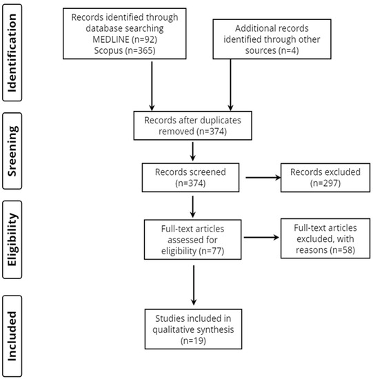 Overall, 461 records were retrieved from the database search. Duplicates and irrelevant studies were excluded; hence, a total of 77 articles were selected. After screening the full text of the articles, 19 studies were eligible for inclusion (Figure 1).