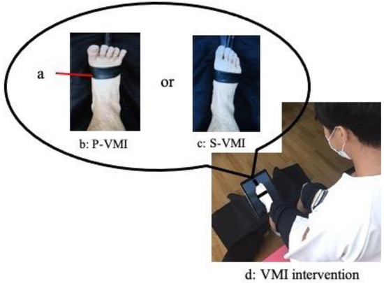The imaging videos used to demonstrate VMI were ankle dorsiflexion movement under two different conditions. In the VMI intervention, the ankle dorsiflexion projection in the video was performed using the participant’s ankle dorsiflexion movement. In the initial video, ankle dorsiflexion was depicted with a TheraBand (Thera-band, Abilities, Tokyo, Japan) wrapped around the foot but without any tension applied (S-VMI). In the second video, the TheraBand was employed to add resistance to the foot, enabling dorsiflexion to be performed with maximal effort (P-VMI). In other words, both image videos showed the TheraBand, but one was not under tension (S-VMI), whereas the other was (P-VMI). The motion of the ankle joint was recorded for the dominant foot. The ankle dorsiflexion frequency for both conditions was set at 1 Hz, and video images were captured by a small LCD screen (iPad Pro, Apple, Cupertino, CA, USA). In this study, interventions were performed on the non-dominant foot only to ensure that all participants received interventions under the same conditions. Before the intervention, the ankle dorsiflexion image videos of the dominant foot were inverted via the software and converted to ankle dorsiflexion image videos of the non-dominant foot. In addition, before the intervention, participants were tasked with distinguishing whether the foot depicted in the image video represented S-VMI or P-VMI. All participants accurately identified whether the foot depicted in the image video was S-VMI or P-VMI. The VMI intervention is shown in Figure 1. Participants were seated in chairs with a table placed over their left foot which was covered with a black cloth so that they could not directly see their non-dominant left foot. The tablet computer was placed on the left ankle joint, and the ankle joint in the image videos was placed in such a way that it overlapped with the left ankle joint. When participants observed the video, they were given the following instructions: “As you do not have to actually move, please imagine that you are performing your own ankle movement in the video image”. The VMI intervention lasted 2 min.