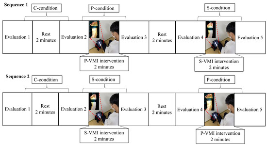 Each participant performed S-VMI and P-VMI interventions on the same day. The control intervention was defined as a 2 min resting position without VMI. The P-VMI, S-VMI, and control interventions were defined as the P-condition, S-condition, and C-condition, respectively. The evaluations were conducted in a blinded assessor fashion. The order of the tasks was as follows: all participants started with C-conditions, followed by P- (Sequence 1) or S-conditions (Sequence 2). The time between the S-condition and P-condition was 2 min. The study protocol is summarized in Figure 2. Participants were sequentially allocated to Sequence 1 or 2 [30]. The specific VMI intervention was performed by rearranging the sequence in which the two groups observed the videos to prevent order effects and reduce the effects of mental fatigue.