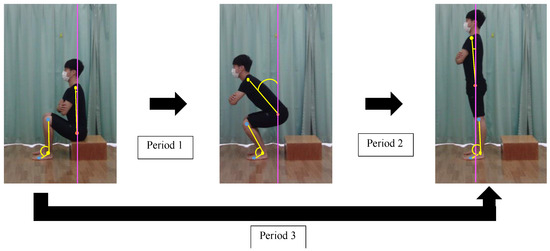 The STS movement was defined in three distinct periods, labeled as periods 1, 2, and 3, in accordance with previous descriptions [38] (Figure 3). To determine the initial and final points of the STS movement, we computed the average angle and standard deviation based on ten consecutive frames capturing the unchanged trunk forward inclination angle immediately preceding the STS movement and following the STS movement utilizing a 2D motion analysis system. Following this, we determined the initiation and conclusion points of the STS movements by adding twice the standard deviation to the mean angle of the 10 consecutive frames capturing the unchanged trunk forward inclination angle, as outlined in a prior study [39]. We computed the duration of the STS movement by dividing the number of frames needed for the three STS periods by 240, which corresponds to the sampling frequency (i.e., the number of frames required during the STS period/240) [22,27].