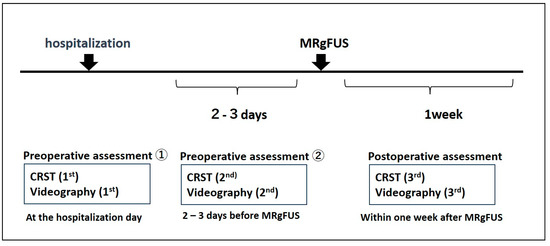 Video recordings of tremor movements and clinical evaluations using CRST were conducted three times: the first preoperative evaluation at the time of hospital admission, the second preoperative evaluation 2–3 days before MRgFUS, and the postoperative evaluation within one week after MRgFUS (Figure 1). The analysis of test–retest reliability was conducted by comparing data from the first and second preoperative evaluations. To assess the effectiveness of MRgFUS, data from the first preoperative evaluation and the postoperative evaluation were compared. Tremor movements during the postural tremor and 15 cm line-drawing tasks in the upper limbs were recorded using a high-definition video imaging device (25 fps, 1280 × 720 px) at a distance of 1.0 m from the patient’s upper limbs. The recorded videos were analyzed using motion analysis software (DIPP-Motion V/2D®, DITECT Corporation, Tokyo, Japan) with digitized data.