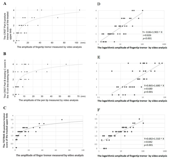Reducing the Ceiling Effect in CRST and TETRAS Evaluations Using Video Analysis. (A) Relationship between CRST Part A scores and the amplitude of videographic parameters during the postural tremor task. The CRST Part A scores are plotted on the vertical axis, with videographic amplitude on the horizontal axis. Approximate curves are shown. (B) Relationship between CRST Part B drawing C scores and the amplitude of videographic parameters in a 15 cm line-drawing task. The CRST Part B drawing C evaluation scores are plotted on the vertical axis, with videographic amplitudes on the horizontal axis. Approximate curves are shown. (C) Relationship between the essential tremor rating assessment scale (TETRAS) 4b postural tremor scores and the amplitude of videographic parameters during the postural tremor task. TETRAS 4b postural tremor scores are on the vertical axis, with videographic amplitude on the horizontal axis. Approximate curves are shown. (D) Correlation between CRST Part A scores and logarithmic videographic amplitude during the postural tremor task. (E) Correlation between CRST Part B drawing C scores and logarithmic videographic amplitude in a 15 cm line-drawing task. (F) Correlation between TETRAS 4b postural tremor scores and logarithmic videographic amplitude during the postural tremor task.