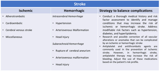 In the last decade, many steps forward have been made in the search for new anticoagulant drugs capable of acting on the pro-coagulative activity of some pathological conditions such as atrial fibrillation or congenital anomalies of the blood coagulation system (factor V deficiency Leiden, protein C, and protein S deficiency, hyperhomocysteinemia) [1,2]. New drugs have therefore been introduced, including direct anticoagulants, which are now key therapies in numerous pathological conditions and are added to antifibrinolytics, platelet inhibitors, and vitamin-K-dependent anticoagulants [1,2,3,4]. Their therapeutic benefits are indisputable; however, all evidence for these treatments must be balanced against the risk of bleeding complications, which are relatively frequent for some of these drugs. Warfarin, the oral anticoagulant that until a few years ago was the most commonly used, substantially increases the risk of major bleeding complications, including hemorrhagic stroke and gastrointestinal bleeding, by up to 3–8% per year [5,6]. Similarly, major bleeding is a serious and frequent complication of all inhibitors of platelet activity, including adenosine diphosphate 3–5 receptor antagonists such as clopidogrel and prasugrel [7,8]. We have therefore focused our attention more on the risk of ischemic stroke in hemorrhagic patients as it always represents a critical issue in the management of patients, especially the most fragile patients. This represents a condition in which it is always difficult to make a choice, with a consequent increase in mortality rates and health care costs in terms of worsening frailty if the patient were to survive. This review analyzes all the aspects linked to these antithetical conditions in order to better think about the appropriate therapies to apply to these patients as categories at greater risk of complications.