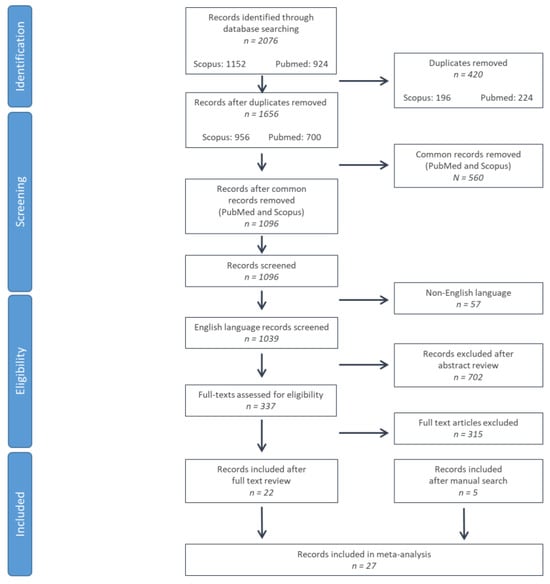 In total, 2076 were identified from PubMed and Scopus databases. After duplicate record elimination, 1096 records were screened by reviewing the title and abstract, eliminating 702 further studies. For the 337 remaining records, full texts were reviewed, eliminating 315 records (unrelated content: n = 280; patient or control group consisting of <10 subjects: n = 22 [,,,,,,,,,,,,,,,,,,,]; full text unavailable: n = 1 []; non-extractable data: n = 1 []; data in median/quartiles: n = 4 [,,,]; identical study cohorts or study cohorts with significant overlap: n = 2 [,]; data on PSP/MSA cohorts without distinction of RS/MSA-P phenotypes: n = 5 [,,,,]). Five studies were identified via manual search of related papers, references, and citing papers [,,,,]. A total of 27 studies were included in the systematic review and meta-analysis [,,,,,,,,,,,,,,,,,,,,,,,,,] (Figure 1).
