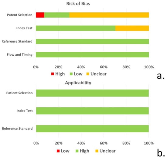 (a) Risk of bias and (b) concerns regarding the applicability of studies for patient selection, index test, reference standard, and flow/timing based on the QUADAS-2 tool.