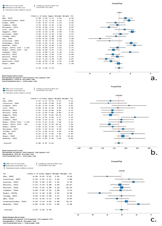 Forrest plots of effect size (as measured according to standardized mean difference-Cohen’s d) of studies on Richardson’s syndrome (RS) patients compared to control subjects for (a) midbrain area; (b) pons area; (c) midbrain-to-pons-area ratio. [,,,,,,,,,,,,,,,,,,,,,,].