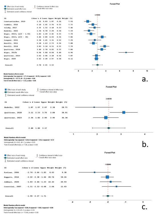 Forrest plots of effect size (as measured by standardized mean difference—Cohen’s d) of studies on Richardson’s syndrome patients compared to control subjects for: (a) MRPI 1; (b) MRPI 2; (c) midbrain volume. [,,,,,,,,,,,,,,,,].