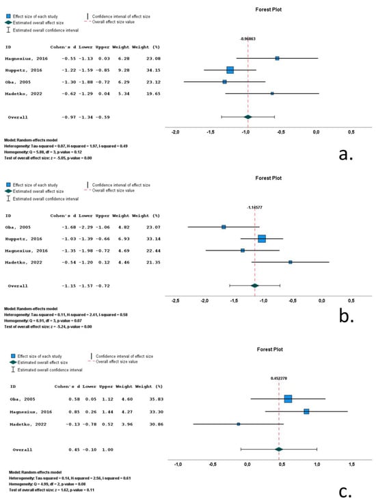 Forrest plots of effect size (as measured by standardized mean difference—Cohen’s d) of studies on MSA-P patients compared to control subjects for: (a) midbrain area; (b) pons area; (c) midbrain-to-pons-area ratio. [,,,].