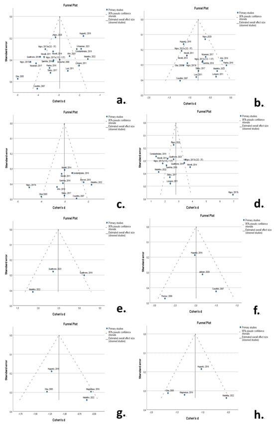 Funnel plots to visualize possible publication bias for: (a) midbrain area in RS; (b) pons area in RS; (c) M/Parea in RS; (d) MRPI 1 in RS; (e) MRPI 2 in RS; (f) midbrain volume in RS; (g) midbrain area in MSA-P; (h) pons area in MSA-P. A degree of asymmetry is evident for midbrain area in RS (a) and MRPI in RS (d). [,,,,,,,,,,,,,,,,,,,,,,,,,].