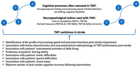 Considering the wide use of TMT in research and clinical settings since its introduction in neuropsychological practice, the purpose of our review was to provide a comprehensive review of the use of TMT in stroke patients in an attempt to mainly identify its role for the evaluation of post-stroke cognitive dysfunction and progression over time, the identification of the underlying neuroanatomical pathology related to impaired TMT performance, and the association with other stroke outcomes, such motor function, driving ability and quality of life.