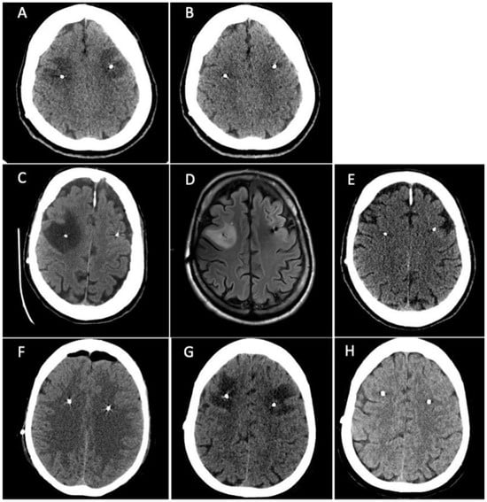 Patient 1. (A) Brain CT scan showed the presence of bilateral frontal subcortical edema surrounding the DBS electrodes. (B) a new brain CT scan showed the complete resolution of brain edema. Patient 2. (C) CT scan revealed the presence of a massive cerebral edema in right frontal lobe, surrounding DBS electrodes. (D) Brain MRI performed fourteen days later confirming the presence of a T2-weighted and FLAIR sequences hyperintense area in the right middle frontal subcortical lobe compatible with cerebral edema. (E) Brain CT scan repeated 30 days later showed the resolution of cerebral edema. Patient 3. (F) postoperative CT scan showed mild asymptomatic left frontal edema surrounding the homolateral DBS electrode. (G) Brain CT scan was repeated showing a great worsening of left middle-upper frontal edema that surrounded the DBS electrodes bilaterally, extending also to the left parietal lobe and near the right coronal suture. (H) Brain CT scan showed resorption of brain edema.