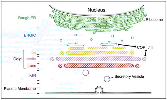 Mammalian eukaryotic cells include various organelles, such as the nucleus, endoplasmic reticulum (ER), Golgi apparatus, lysosome, mitochondria, and peroxisome. Each organelle has a specific function. The Golgi apparatus plays a central role in intracellular protein transport by modifying a wide variety of proteins (cargo proteins) made in the ER with glycosylation and other modifications and transporting each to the designated organelle for functionality (Figure 1). The Golgi apparatus consists of stacks of flat cisternae, which collectively form structures known as Golgi ribbons. The Golgi stacks are polarized; the side of the stack that receives the cargo is called the cis–Golgi and the opposite side where the cargo leaves the stack is called the trans–Golgi. The enzymes that dispose of the cargo in the Golgi apparatus are widely distributed in a manner that reflects a sequential pattern of action on the cargo as it passes from cis– to trans–Golgi [1,2,3].